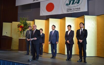 【茨城】茨城県高速道路交通安全協議会(小林幹愛会長)は9日、常磐自動車道下り・友部サービスエリア(SA)で春の交通安全キャンペーンを実施し、多くの来場者らに安全運転を呼び掛けた。11日からスタートする春の全国交通安全運動に先駆けて周知することで、交通事故防止の意識高揚を図った。 県警高速道路交通警察隊の黒沢和幸隊長のあいさつに続き、小林会長は「今年は統一地方選の関係で、例年より1カ月遅れでの開催となった。陽気が良いので、居眠り運転にも注意しなければならない。重大事故となりやすい高速道路上では、特に安全意識の徹底が欠かせない」と呼び掛けた。 キャンペーンには県警音楽隊も参加。オープニングではカラーガード隊と共ににミニコンサートを行い、多くの来場者が足を止めていた。また、観光協会からはミス水戸に当たる「水戸の梅大使」も駆け付け、会場は華やいだ雰囲気となった。 来場者らに交通安全グッズとペチュニア500鉢を配布して、事故防止を呼び掛けた。「安全運転が根付くように」との願いを込めた鉢植えは来場者に人気で、開始後わずか10分足らずで無くなった。(谷本博) 【写真=来場者に鉢植えを配る「水戸の梅大使」】
