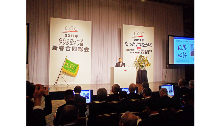 全国の中堅・中小食品スーパーマーケットで構成する協業組織、シジシージャパン(堀内淳弘CGCグループ代表、東京都新宿区)は2017年度、関東に共同利用型プロセスセンター(PC)を開設するとともに、自前のセンターを持たないグループ加盟企業などと関東共配グループ(仮称)を設立し、物流の高度化を志向する。1月26日に開かれたCGCグループ・アソシエイツ会(森山透会長)の新春合同総会で、堀内要助社長が明らかにした。(沢田顕嗣) 堀内氏は17年度のCGCグループ活動スローガン「もっと、つながる第2章本気でコミュニケ、伝える、伝わる2020年を見据えて、価値創造」に込めた思いを説明。CGCグループを「巨大なバリューチェーン」と規定した上で、加盟企業やアソシエイツ会一体となり、物流やシステムなど八つの協業活動を更に加速させる考えを強調した。 物流の高度化を図る施策では、16年11月に初の共同PCを静岡県掛川市に稼働させたのに続き、埼玉県と神奈川県にも生鮮の共同PCの開設を計画しており、17年度内に3カ所の共同PCで関東・東海地区をカバーする構想を示した。 また、関東共配グループには自前のセンターを持たない北関東、神奈川、千葉の53社398店舗(総売上高3699億円)の参加を見込み、既存センターを活用してコストダウンや人手不足対応など物流課題の解決に向け連携を促進するとともに、仕入れやバックオフィス(販促や受発注など)機能の統合を検討していく。 このほか、16年11月にCGC海外アソシエイツ会中国安心部会を発足したとの報告に加え、ASEAN(東南アジア諸国連合)地域でも同様の組織を立ち上げたい意向を表明した。 原和彦会長は「アマゾン(ジャパン)がいよいよ日本で生鮮を販売する準備を始めたと聞いた。食品小売業界の競争は一層激化していく。課題解決の糸口はグループの連携をより強めること。製・配・販が一体となり、スローガンを具現化していきたい」と述べた。 【写真=グループ活動スローガンに込めた思いを説明】