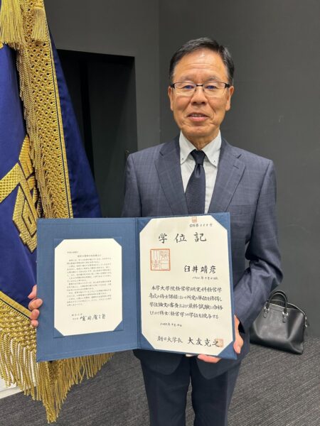 岐阜県トラック協会(山口嘉彦会長)の臼井靖彦専務は9月19日、朝日大学大学院の経営学研究科で修士号を取得した。学位論文は、トラック事業者の法令順守を支援するウェブアプリケーション研究がテーマで、臼井氏は研究領域「グローバルロジスティクス」での修士号取得第1号となった。(星野誠)