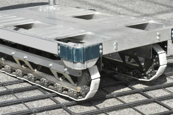 台車用クローラは倉庫など物流現場での使用を想定した新しいコンセプトの製品。既存の1㌧キャスター平床台車からキャスターを取り外し、クローラへ付け替えることで、溝や段差などのある場所でも安定して運べる。