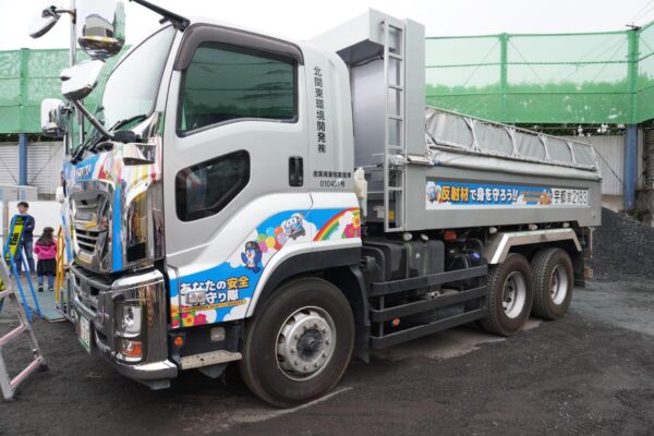 車両を提供したのは北関東環境開発(奥田美弘社長、那須塩原市)。産業廃棄物などを扱う同社では、ダンプ車のイメージ改善が課題だった。奥田社長は「大きなダンプ車が出入りする、塀に囲まれたところで怖い人たちが何かやっている会社でしょ、と従業員が言われたと聞いた時、衝撃を受けた」と話す。