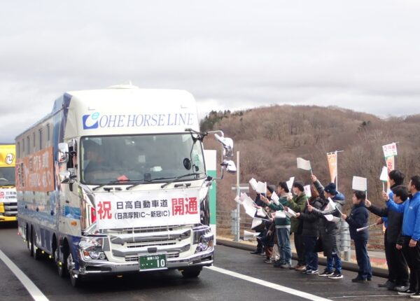 日高自動車道の日高厚賀インターチェンジ(IC、北海道日高町)―新冠IC(新冠町)を結ぶ9.1㌔が2月28日、開通した。室蘭開発建設部によると、苫小牧市―新ひだか町の所要時間は夏期で7分、冬期は6分、それぞれ短縮される見込み。競走馬や農産物の輸送効率化が期待できる。同日、開通記念式と通り初めが行われた。(朽木崇洋)